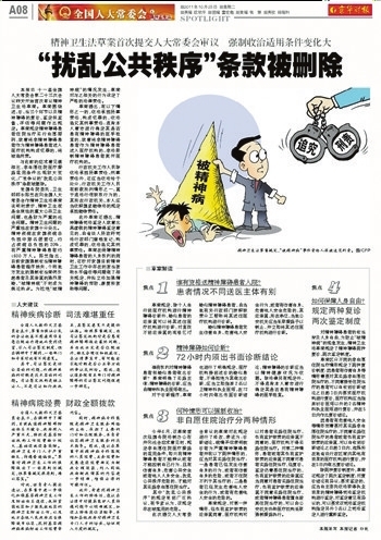 精神卫生法草案首次提交全国人大常委会审议,与此前的征求意见稿相比,非自愿住院医疗措施适用条件出现较大变化,广受争议的“扰乱公共秩序”条款被删除。