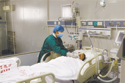 4月16日,河南开封,患者马某某(男,34岁,从事厨师职业)在淮河医院重症监护室接受治疗。王天灏 摄