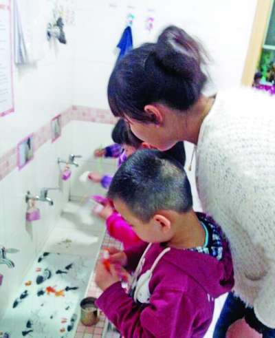 刷牙,在老师指导下,孩子们马马虎虎做好了。