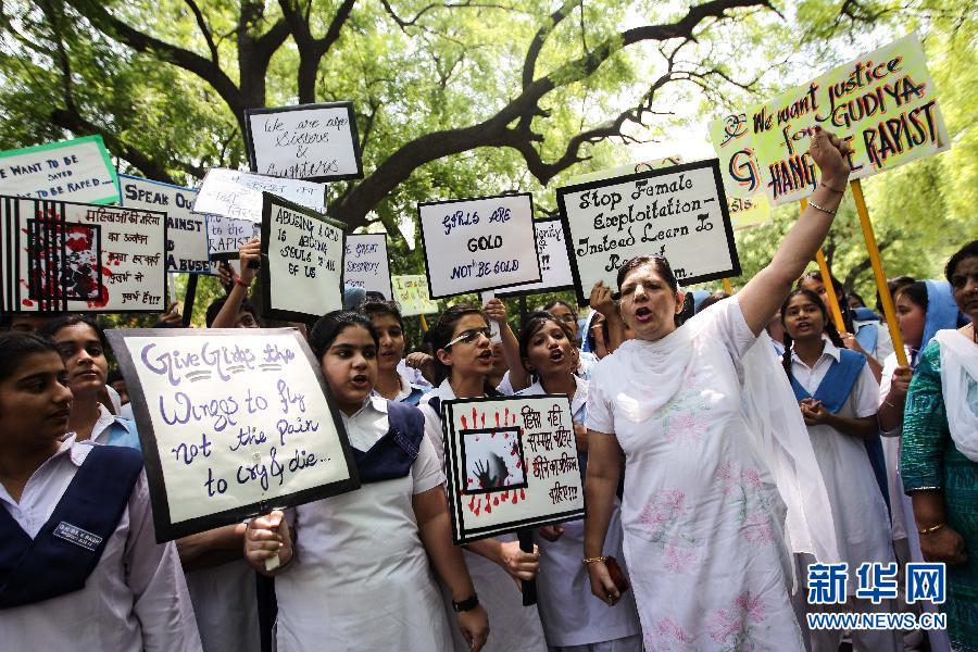 4月23日,在印度首都新德里,中学生手持标语牌参加游行。当日,印度首都新德里多所中学的学生在市中心举行示威游行,呼吁政府采取措施保护女性的安全。近期,女性遭性侵事件因公众关注度上升而屡见报端。新华社记者郑焕松摄