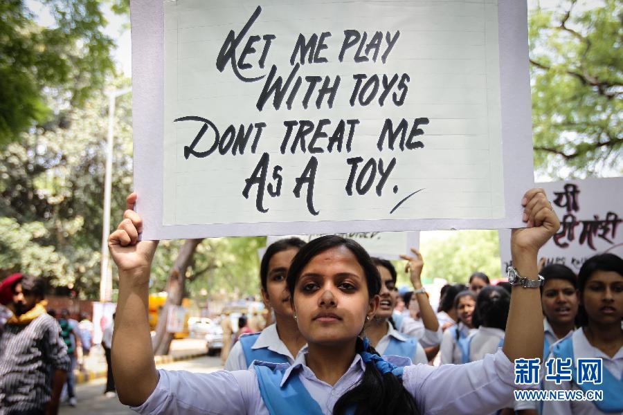 4月23日,在印度首都新德里,一名中学生手持写有“让我用玩具游戏,别把我当做游戏的玩具”字样的标语牌参加游行。当日,印度首都新德里多所中学的学生在市中心举行示威游行,呼吁政府采取措施保护女性的安全。近期,女性遭性侵事件因公众关注度上升而屡见报端。新华社记者郑焕松摄