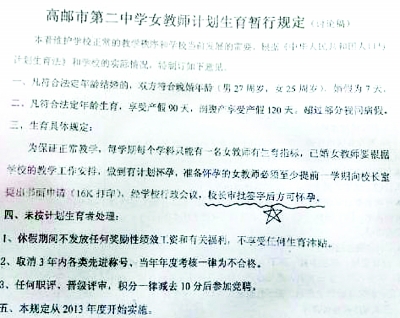 可是,再浏览第三项:“为了保证正常教学,每学期每个学科只能有一名女教师有生育指标,已婚女教师要根据学校的教学工作安排,做到有计划怀孕。准备怀孕的女教师必须提前一学期向校长室提出书面申请,经学校行政会议(研究),校长审批签字方可怀孕。”这当中,还列出了不按规定生育者的处罚规定,除了享受不到生育补贴外,还有取消3年内各类先进称号,任何职评、晋级评审积分减分等处罚。