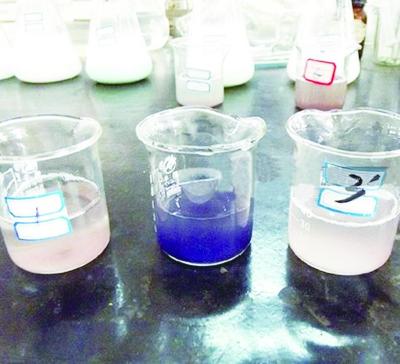 经检验,6种牙膏或多或少都含有漂白物质,其中,1号3号牙膏严重褪色。(图:广西新闻网)