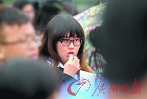 招聘会现场,一名学子临面试前再补一下妆。(资料图片) 记者顾展旭 摄