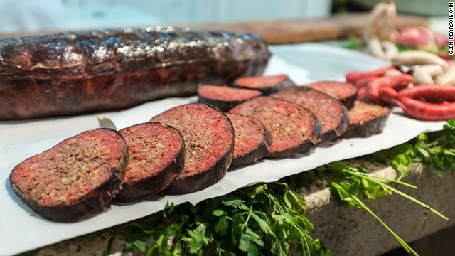骆驼脾脏腊肠 想品尝一种不同口味的腊肠,何不尝试一下填充骆驼脾脏。先在骆驼脾脏里填充牛肉、羊肉、或者骆驼肉,还有橄榄油、香料以及一点点的驼峰脂肪,将整个被填充的脾脏放在烤箱里烘烤。然后把它切成片,再进行烘烤,夹在三明治里。一个三明治售价1.77美元(约合人民币10.9元)。它的质地柔滑细腻,吃起来很有味道,有点像牛肝的味道。或者您可以去当地的咖啡店Cafe Clock品尝著名的骆驼汉堡,再配上炸薯条和沙拉。 "