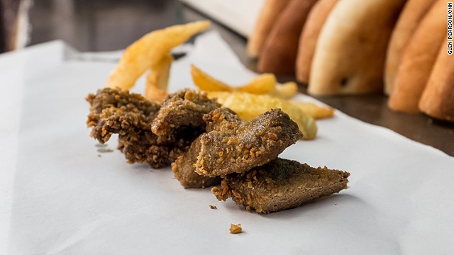 炸碎牛肝 摩洛哥人可真能从头吃到尾啊。在这里,你可以品尝到奶牛的乳房、舌头、牛肚、甚至蹄子。炸牛肝是由小牛的肝脏制成的,先把肝脏弄碎,再进行煎炸。在露天市场上的食物是称重销售的,一份炸牛肝大约卖1.18美元(约合人民币7.2元),它通常是夹在三明治里,或者与炸薯条配在一起吃。