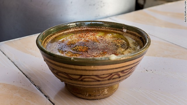 比萨拉(Bessara,一种蚕豆汤) 一碗丰盛的蚕豆汤,再配着硬皮面包(khobz),这是上班一族最爱的早餐,而且只需花费0.59美元(约合人民币3.6元)。在一些小餐馆里,还会在碗蚕豆汤里倒上一小口的柠檬橄榄油,撒上一小撮的孜然和辣椒粉,就可成为一顿午餐了。在这汤里还有许多大蒜,一旦小摊贩售完这蚕豆汤,他就可以收摊了。 "