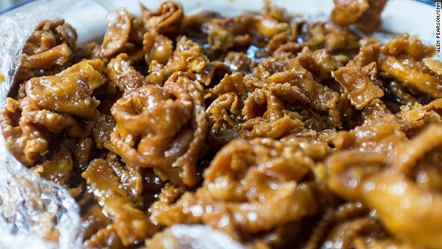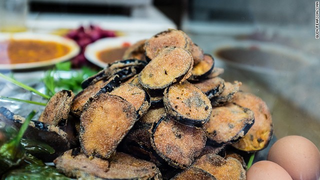 油煎茄子片 素食主义者也可以在露天市场上找到自己的食物,那就是油煎茄子片。先把切成片的茄子在甜甜的烟熏辣椒面酱里浸蘸,然后进行煎炸。一片0.12美元(约合人民币0.7元)。这种油煎茄片可以与lubia(一种白扁豆,在番茄、孜然、红辣椒、大蒜、生姜混合而成的酱中炖熟) 一起吃,或者和新鲜的蔬菜沙拉一起吃。 "