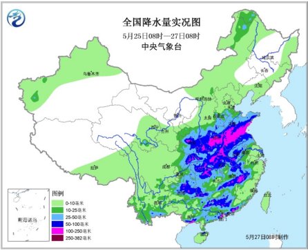 据统计,自5月25日以来,我国有12个省(市、区)出现大范围暴雨天气,大暴雨区域分布在河南、湖北、山东一带;河南汝州局地累计雨量有286毫米,广东汕尾局地达382毫米。