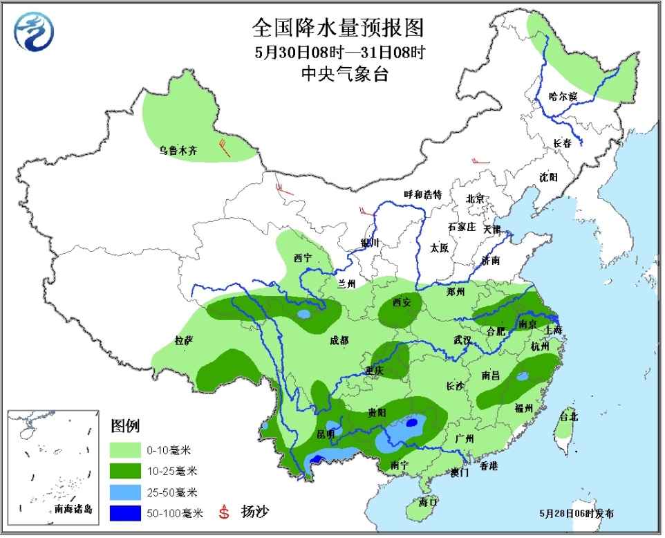 28~30日,西北地区东南部、四川盆地北部和东部、云贵高原南部等地的部分地区有大雨或暴雨,局地有大暴雨(100~120毫米);上述局地并伴有短时雷雨大风或冰雹等强对流天气。另外,28日,新疆南疆盆地西部局地有中到大雨。