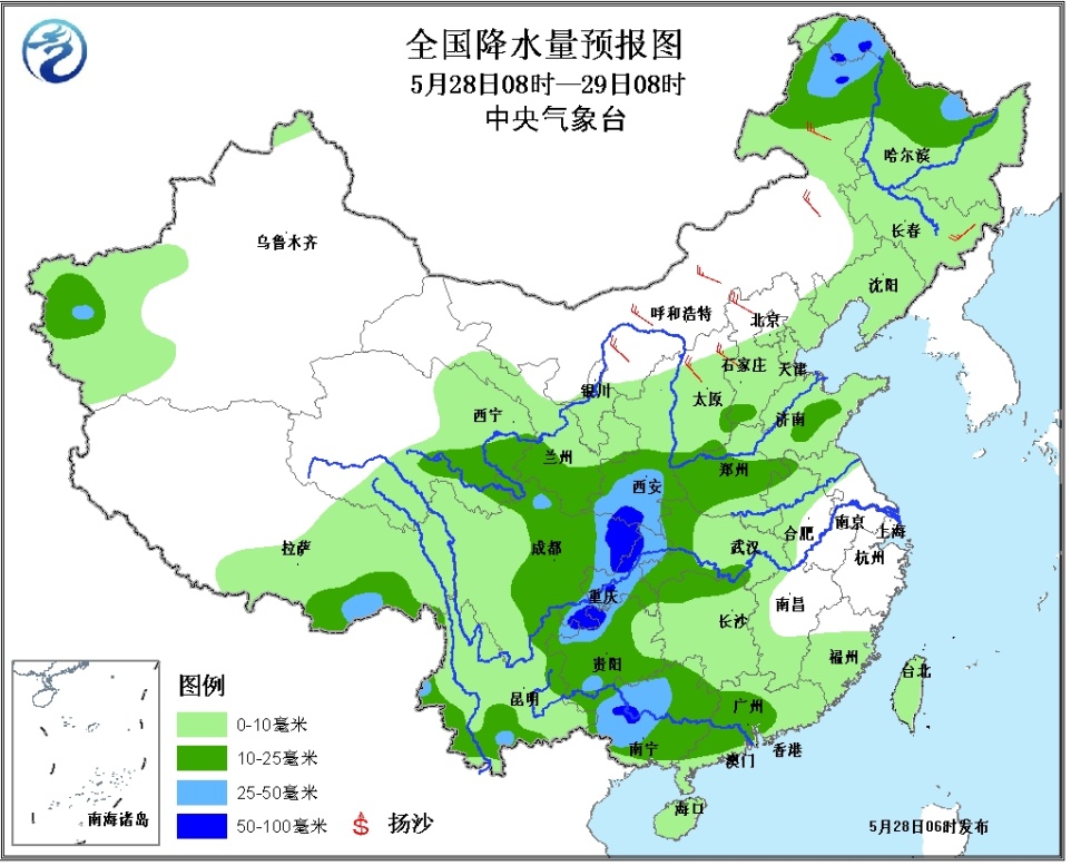 28日08时至29日08时,内蒙古东北部、黑龙江北部、西北地区东南部、黄淮西部、西南地区东部、华南中西部等地有中到大雨,其中,陕西南部、四川东北部、重庆西部、广西西部等地的部分地区有暴雨(50~80毫米);新疆南疆盆地西部、云南西部和南部的局地有大雨;上述地区局地并有短时雷雨大风等强对流天气。内蒙古中东部、华北北部、东北地区等地有4~6级风。