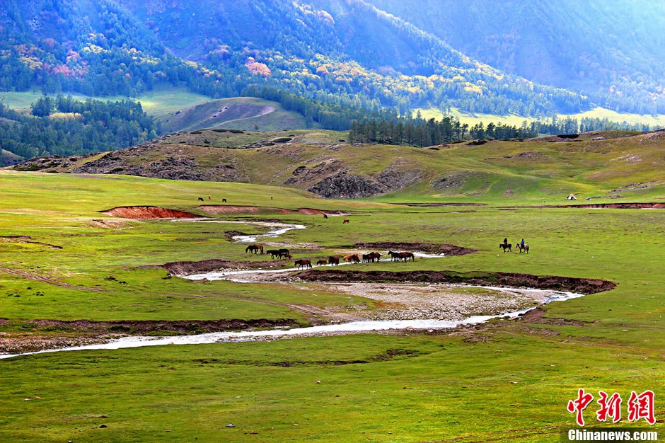 进入5月以后,位于新疆北部边缘的阿勒泰地区,草原之上草青花开,像一轴烂漫多彩的画卷。背阴的山洼里尚存片片残雪,向阳的草坡上泛起青绿。哈萨克牧民转场的驼队已经行进在山谷中的羊肠小道上。王宏山 摄