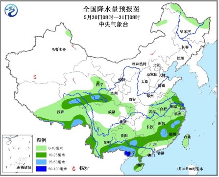 中央气象台预测,5月30日08时至31日08时,青藏高原东部、甘肃南部、陕西南部、江淮及其以南大部地区有小到中雨或阵雨,其中,广西中西部、云南东南部、江西南部、福建西部等地的部分地区有大雨,局地暴雨(50~90毫米),另外,青海南部、西藏南部的部分地区有大雨(25~45毫米);上述地区局地并有短时雷雨大风冰雹等强对流天气。新疆东部、内蒙古中东部、东北地区中西部有4~6级风。
