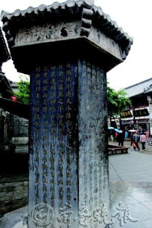 ▲周村古商城内,在石碑前拍照留影的游客在石碑上留下大片油渍。记者 王鑫 摄