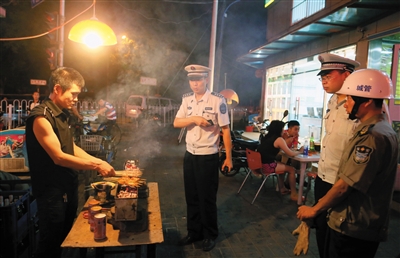 昨日,光彩路和南顶路交叉路口,城管队员规劝一位户外卖烧烤的摊主撤摊。新京报记者 薛珺 摄