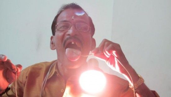 【环球网报道记者朱盈库】据“odditycentral.com”网站6月3日报道,1/10安的电流可以把一般人电死,但印度男子拉杰(Raj Mohan Nair)可不是一般人。他的身体可以承受几安的电流,并且毫发无损。