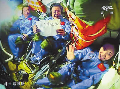图为神舟十号航天员从太空送来端午祝福(6月12日摄于北京航天飞行控制中心大屏幕)。
