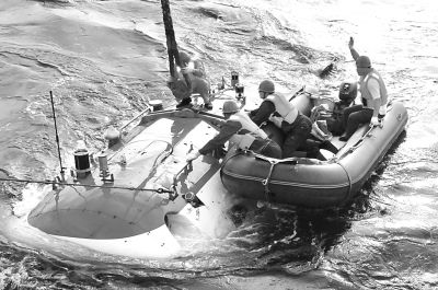6月17日,工作人员在给“蛟龙”号载人潜水器挂缆。 新华社记者 张旭东摄