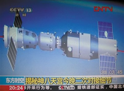 昨晚8时,天宫一号与神舟八号第二次成功对接。(视频截图)