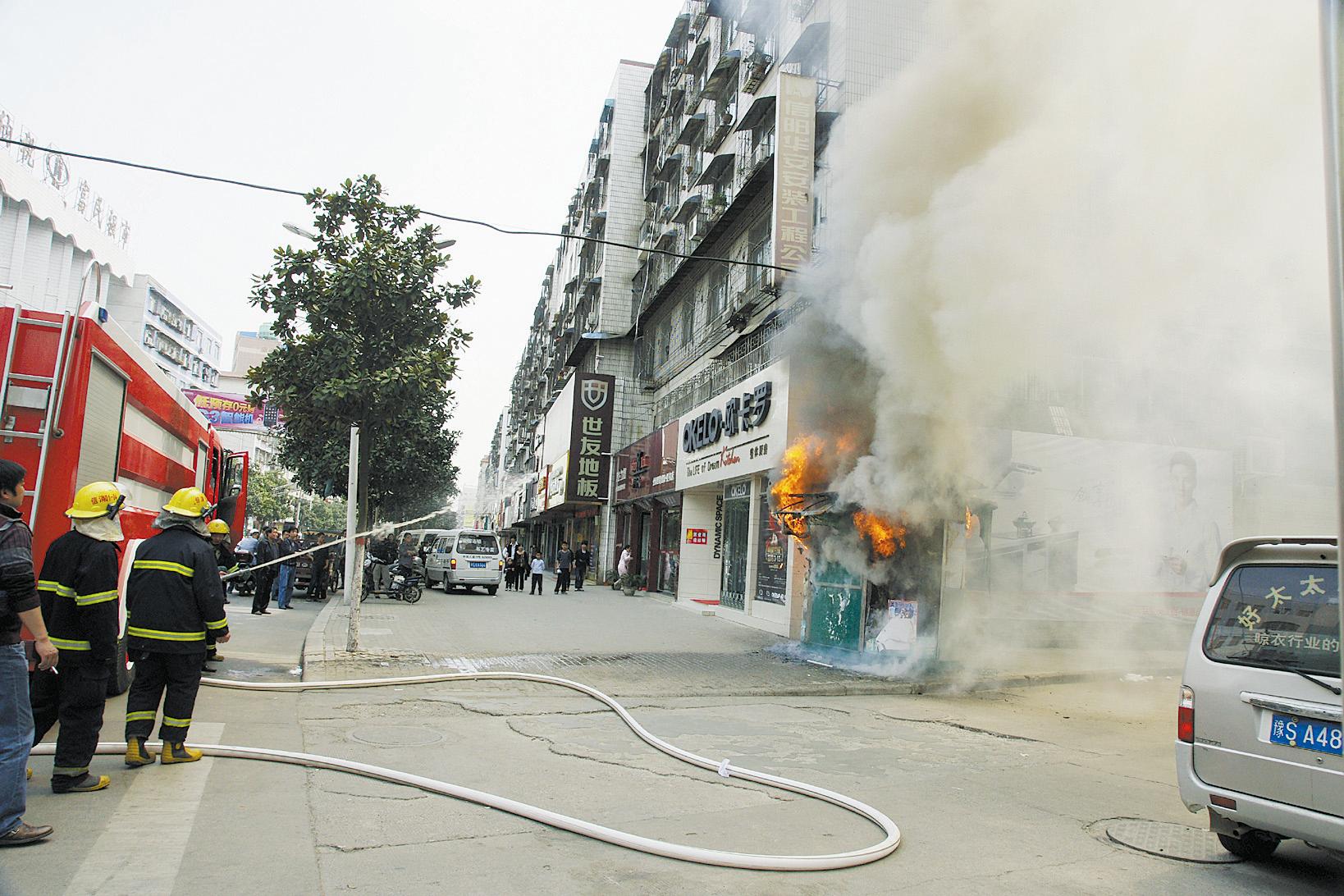 4月7日中午,市中心城区申城大道与胜利路交叉口东侧的一个报亭突发大火,因为里面都是易燃物品,火势发展很快,火舌伴随滚滚浓烟几乎快将旁边的一家商店引燃。幸亏消防车及时赶到,消防队员迅速将大火扑灭,此时报亭已经全部烧毁,但是没有造成人员伤亡。记者 郝光 摄