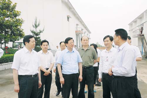 5月14日,国家粮食局局长任正晓(前排中)在市委书记郭瑞民(左一)等的陪同下在罗山县国家粮食储备库调研。