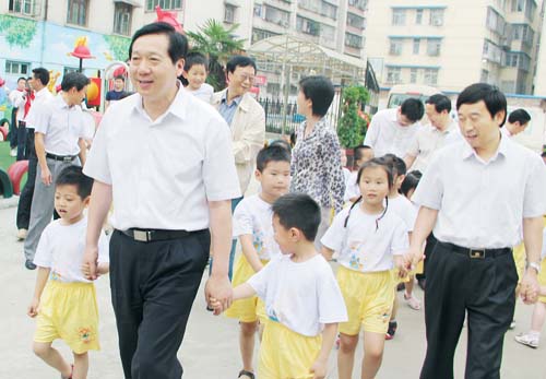 每年的“六一”前夕,信阳市第十三小学都会举行少先队新队员入队仪式。郭瑞民一行来到市十三小时,学校正在举行新队员入队仪式。看见市领导来看望他们,孩子们纷纷围了上来,为市领导系上了红领巾。郭瑞民牵着一个小朋友的手亲切和蔼地问:“今年几岁了?”