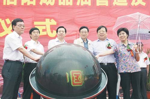 仪式上,市委书记郭瑞民宣布中石化驻马店—信阳成品油管道及下载库项目开工,并与乔新江、姚铁璜、王道云、田中山、闫佑民共同为项目开工按下启动球。