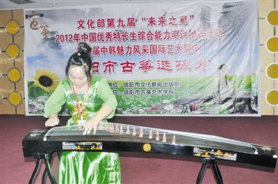 文化部第九届“未来之星”2012年中国优秀特长生综合能力测评推选活动第四届中韩魅力风采国际艺术展演信阳古筝选拔赛,于7月8日在金通大酒店二楼演播大厅举行,来自全市近百名古筝高手参加了选拔赛。图为一名初中组选手参赛时的一个镜头。本报记者 郝 光 摄