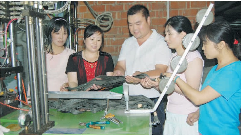 光山县殷棚乡五座楼村农民杨庆志在广东省增城市打工学会了一手过硬的电器自动化制作服装专用拉链技术,被广东省增城市三合拉链制作厂以年薪16万元聘为厂长。为了改变家乡贫困农民就业难问题,杨庆志毅然放弃了优越的工作条件和丰厚的经济收入,回乡自筹资金500万元,于2009年12月在光山县城南创办了河南省规模较大的光山县阳光拉链厂,并在全县招收83名贫困农民子女、退伍军人、大学生等。这些贫困对象上岗后年人均收入2.9万元。图为杨庆志(左三)正在指导工人生产拉链时的情景。谢万柏 摄