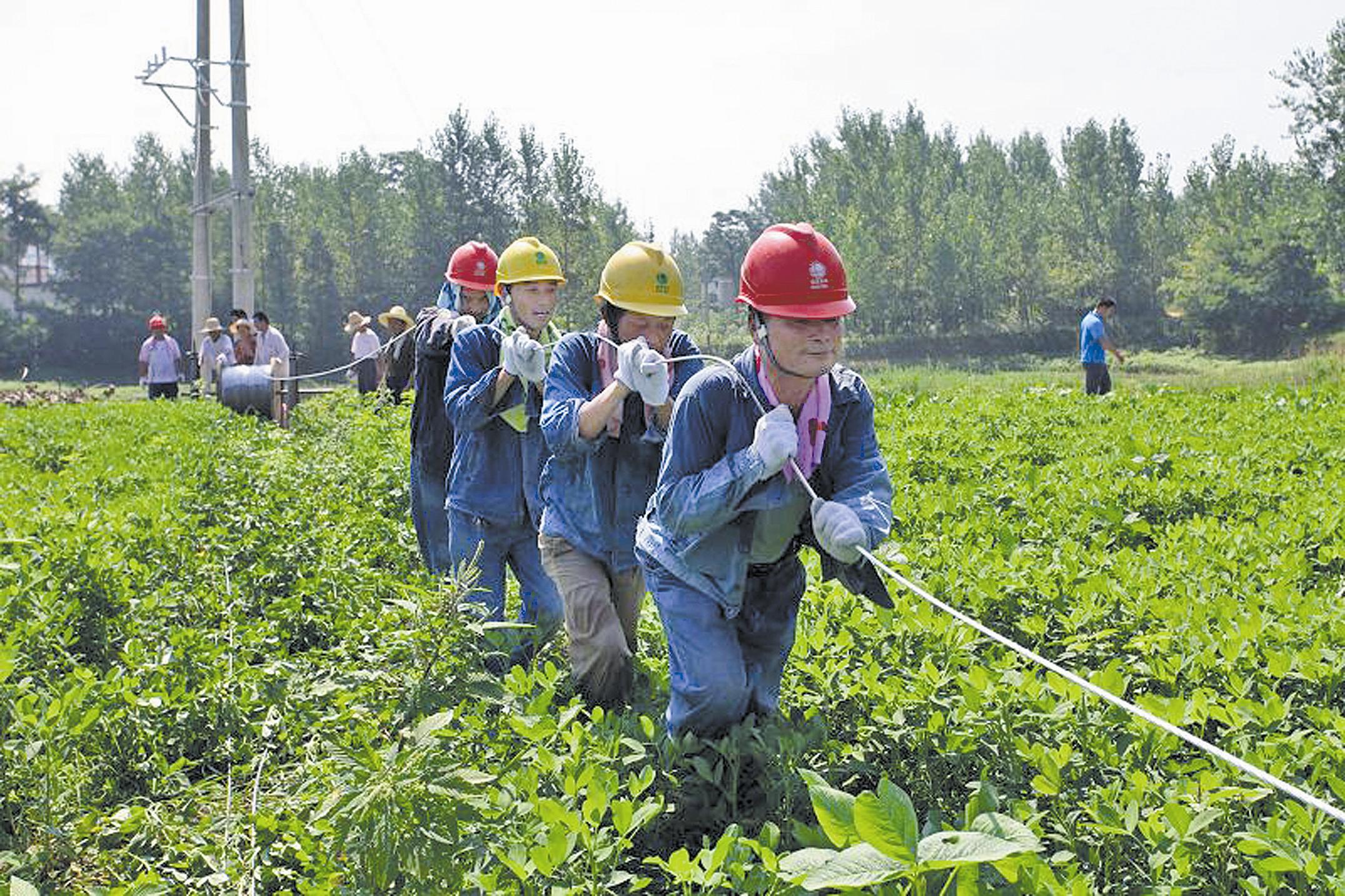 受近日高温少雨天气影响,潢川县抗旱抽水用电负荷骤增。该县电业局紧急行动,全力保障农业生产用电需求。图为7月24日,该县电力人员在该县谈店乡陈堰村为农户架设抽水专用线路。陈伟 摄