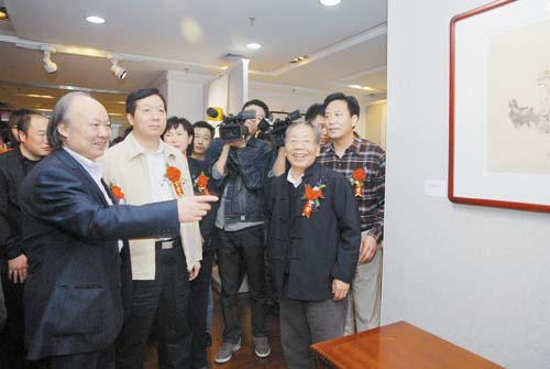 全国人大常委、著名画家杨长槐(右二),市委书记郭瑞民(左二)等领导参观赵根成(左一)中国人物画作品展。