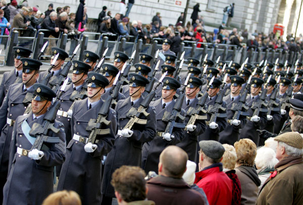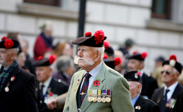 11日是一战停战日,也是英国的“荣军日”。此前的一周里,英国人就开始在胸前戴上了纸质的红色罂粟花,而这一天,身穿黑衣头戴黑色礼帽的英国女王向一战阵亡将士纪念碑敬献了花环。威廉王子也献上花环,随后是英国外交大臣威廉·黑格。当退伍老兵组成的队伍经过纪念碑时,人群中爆发出热烈的掌声。