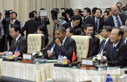 11月20日,参加东盟峰会的美国总统奥巴马坐在中日首脑之间。