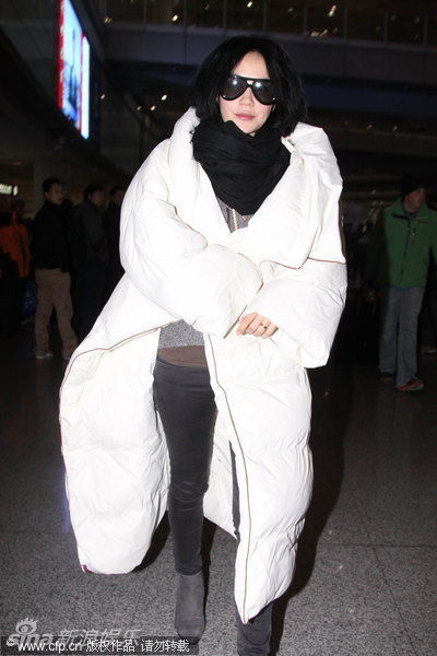 天后王菲一直走在时尚前沿。春晚亮相其穿着高跟鞋套丝袜的做法就让很多人竞相模仿,日前王菲身穿新款羽绒服出现在机场。时装专栏作者在微博中对王菲的羽绒服进行点评称群众会以为她冷疯了抱着棉被坐飞机。为此王菲微博回应称就喜欢这羽绒服像被子,随即晒出了身穿这件硕大羽绒服的霸气背影,宛如一床白色的羽绒被铺在大地上。