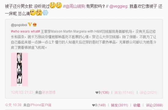 12月3日21时23分时尚专栏作者“gogoboi”在新浪微博中点评了王菲的新款白色羽绒服。gogoboi称王菲这款羽绒服穿上身懂行的人知道天后这穿的是时下最热单品,无辜群众可都以为她是冷疯了裹着棉被坐飞机。 为此王菲转发微博回应称自己就喜欢这件羽绒服像被子,“就喜欢它像被子 还一床呢 总么滴。”随即有网友问这款羽绒服是否有男款的,王菲则搞怪回答称:“被子还分男女款 没听说过。”