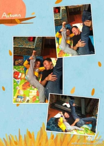 昨晚,孙悦在微博中晒出儿子与干爹同展身手的照片,照片中调皮的儿子与干爹平躺在床上将腿抬高,互相比试身手,孙悦也在一旁打趣道,“少林武功揍是这么练出来的。” (七仔)