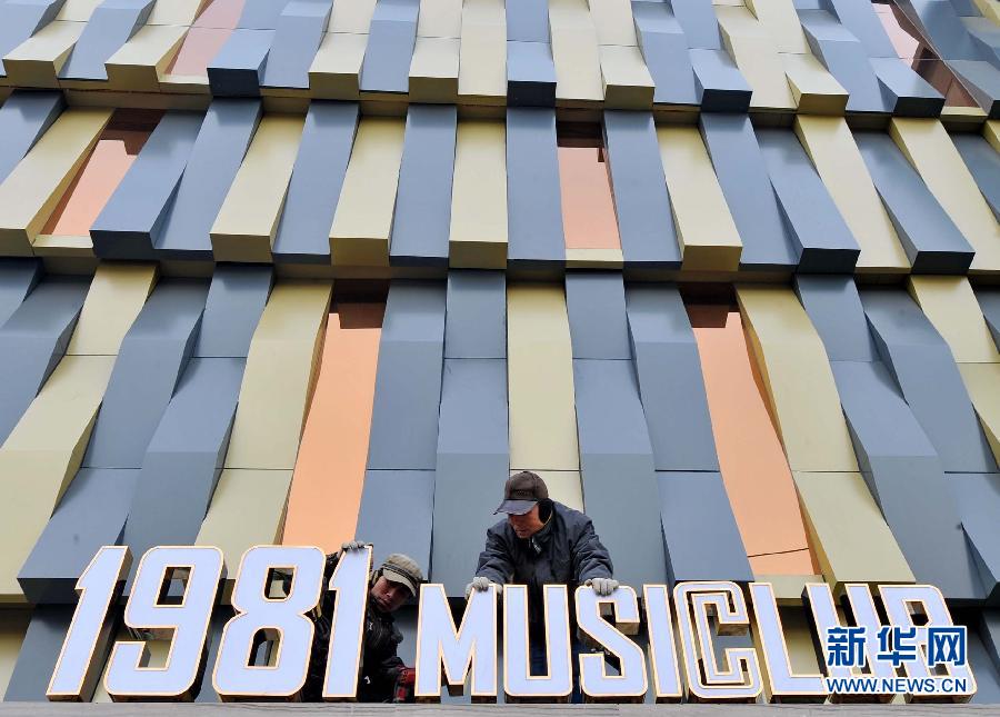 12月19日,工人在安装“1981音乐俱乐部”牌匾。演员小沈阳参股开办的高档酒吧“1981音乐俱乐部”位于辽宁省沈阳市和平区黄金地段,共有3层,内部总面积2000多平方米。据业内人士介绍,该酒吧装修档次在辽宁地区堪称一流。该酒吧将于12月22日正式开业。 新华社发