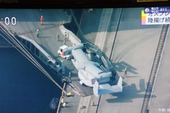 “鱼鹰”运输机登陆山口县岩国基地港口的情景(NHK电视截屏)