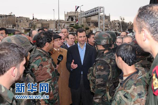 3月27日,在叙利亚霍姆斯市巴卜阿鲁姆区,叙利亚总统巴沙尔•阿萨德(中)向支持人群发表讲话。叙利亚总统巴沙尔•阿萨德当日视察了政府军与反对派武装曾发生严重冲突的中部霍姆斯市巴卜阿鲁姆区。 新华社发(叙利亚国家通讯社提供)