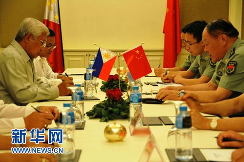 资料图: 5月28日,中国国务委员兼国防部长梁光烈上将(右一)与菲律宾国防部长加斯明(左一)在柬埔寨首都金边举行会谈。