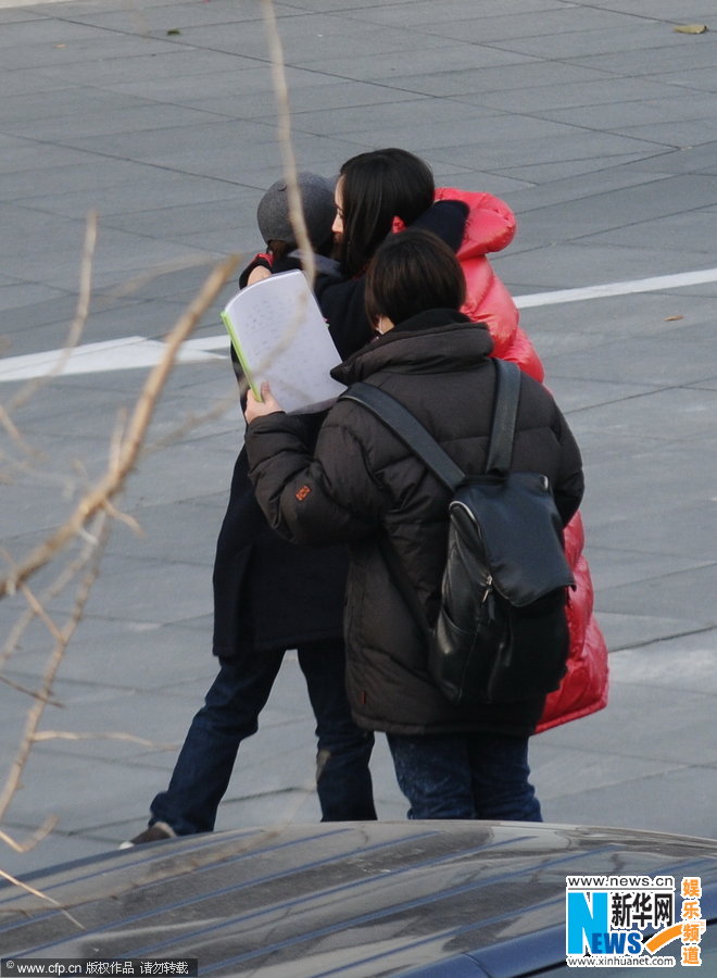 杨幂裹红羽绒服保暖收工 见郭敬明相拥许久(图)