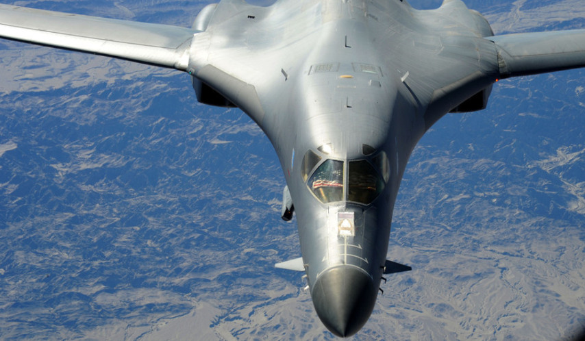 2012年12月22日,在阿富汗上空第340远征空中加油中队的一架KC-135加油机,正在准备为一架部署在埃尔斯沃思空军基地的B-1B战略轰炸机进行空中加油。B-1B驾驶员在驾驶舱内高举国旗表示致意。