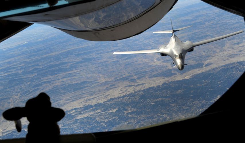 实拍美军战略轰炸机空中加油 飞行员高举国旗