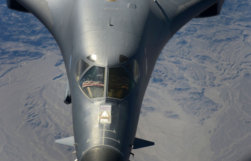 实拍美军战略轰炸机空中加油 飞行员高举国旗