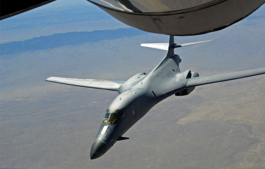实拍美军战略轰炸机空中加油 飞行员高举国旗