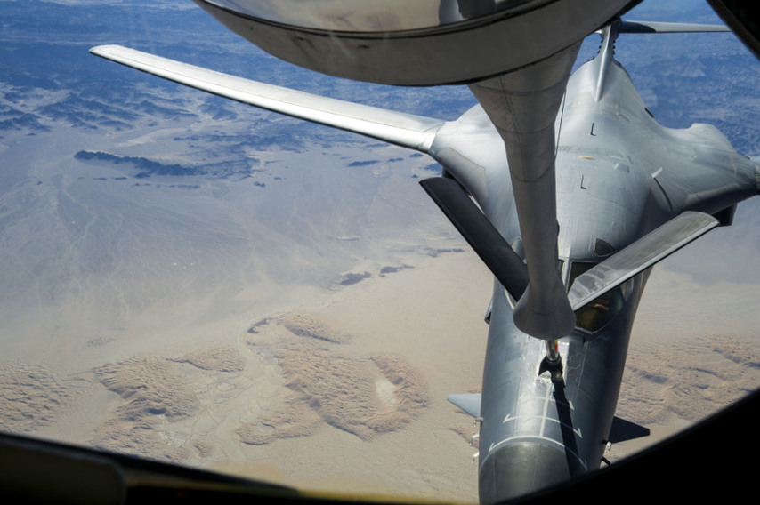 实拍美军战略轰炸机空中加油 飞行员高举国旗