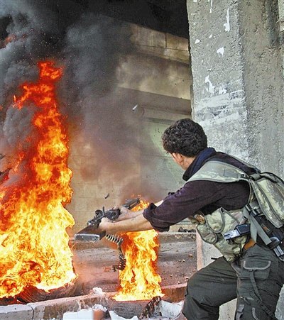 11月13日,在叙利亚阿勒颇,一名反对派武装人员在射击。当日,叙利亚政府军与反对派武装在多地进行激烈交战。