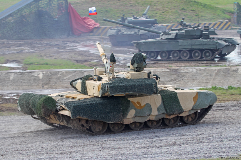 在防御方面,T-90SM并未大规模变更T-90原有的复合装甲结构,而是通过加大反应装甲覆盖范围和换装新一代反应装甲来强化防御能力。T-90SM的反应装甲完整覆盖炮塔正面与车头上半部、车体两侧的侧裙及炮塔顶部的前半部。