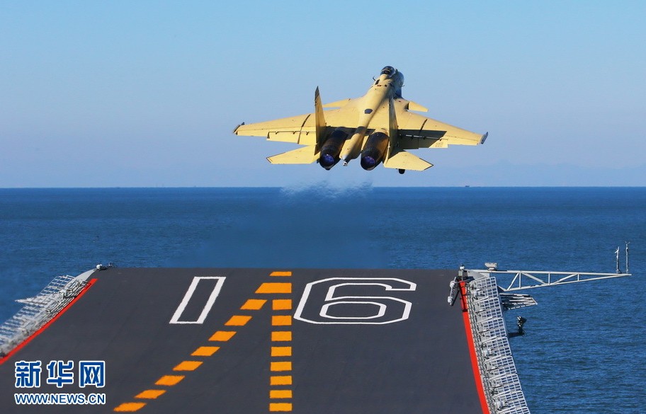 歼—15飞机在“辽宁舰”上滑跃起飞。新华军事记者 查春明摄
