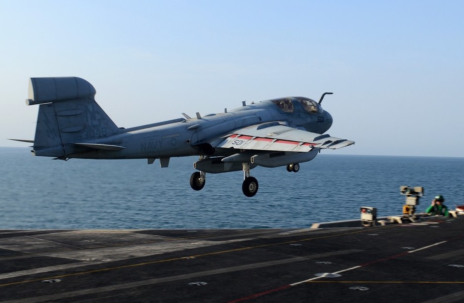 正从华盛顿号上起飞的美军EA-6B徘徊者电子战机。